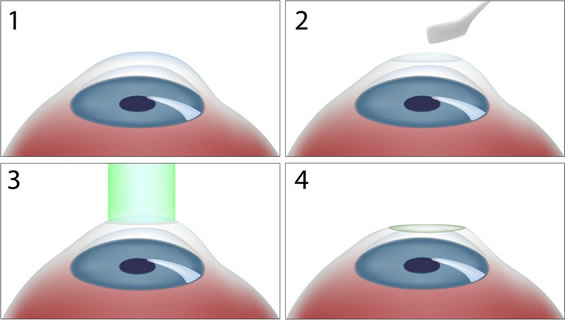 Bei der PRK wird zunächst die oberste Schicht der Hornhaut (Epithel) mittels einer Bürste, Schaber oder mit dem Laser (sog. Trans-PRK oder no-touch Technik) entfernt (2). Danach wird das darunterliegende Hornhautstroma mittels Excimer-Laser computergestützt abgetragen (3). Durch die daraus resultierende Veränderung der Hornhautkrümmung verändert sich auch die Brechkraft der Hornhaut, somit werden die Lichstrahlen scharf auf der Netzhautoberfläche abgebildet. Ziel ist es, dass der Patient ohne Brille scharf sehen kann. Da die Hornhautoberfläche nach der Behandlung offen ist, wird eine Verbandskontaktlinse auf das Auge gelegt (4). Das Epithel verheilt in den darauffolgenden 3-4 Tagen. Die Kontaktlinse wird dann wieder durch den Augenarzt entfernt.